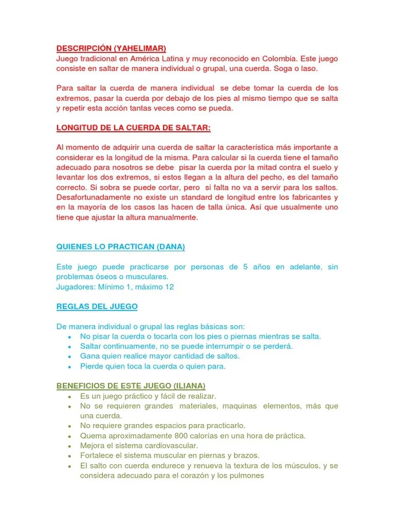Junto a la docente de educación física virginia arango, compartimos esta clase donde aprendimos diferentes juegos para saltar la soga. Cada alumno tendrá una cuerda e irá realizando los siguientes ejercicios: Salto en el lugar como puedo.